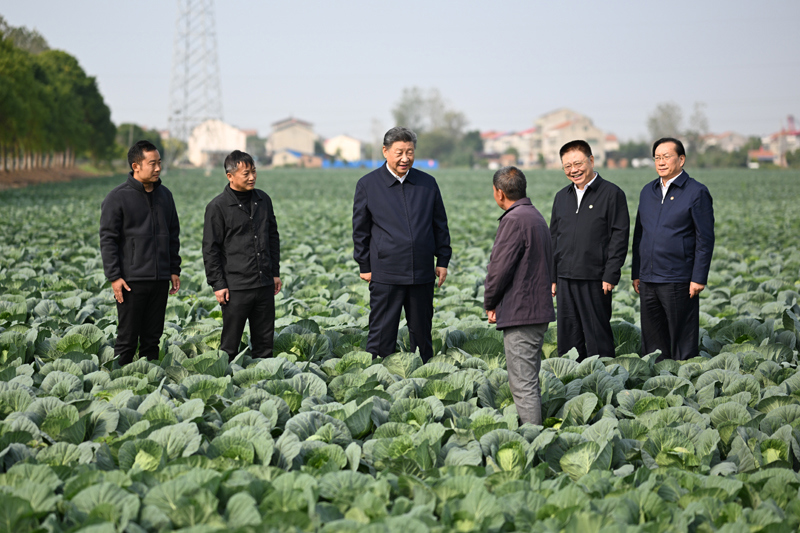 5日上午,習近平前往咸寧市嘉魚縣,首先到潘家灣鎮十里蔬菜長廊考察。深秋時節,這里仍然滿目青翠、生機勃勃。習近平走進田間,察看蔬菜長勢,詳細詢問蔬菜品種、種植技術、銷售等情況。他強調,農村天地廣闊,農業大有可為。發展現代農業,建設農業強國,必須依靠科技進步,讓科技為農業現代化插上騰飛的翅膀。他勉勵當地干部群眾走科技之路、質量之路、品牌之路,把蔬菜種植這個富民產業進一步做好,讓更多群眾增收致富。