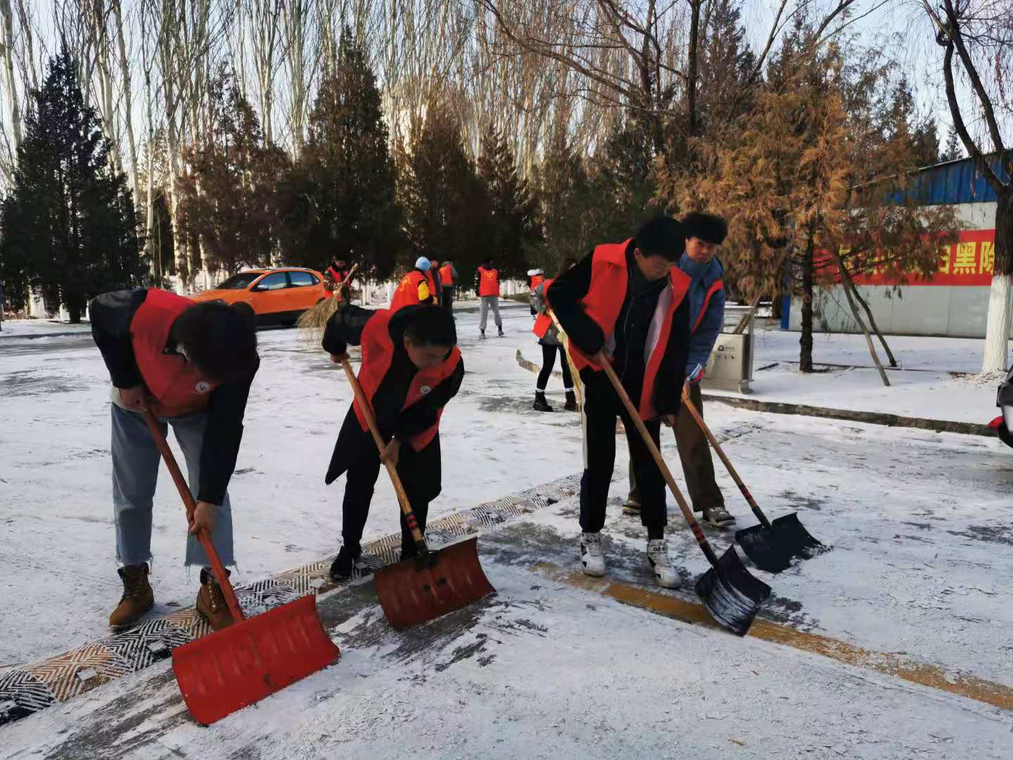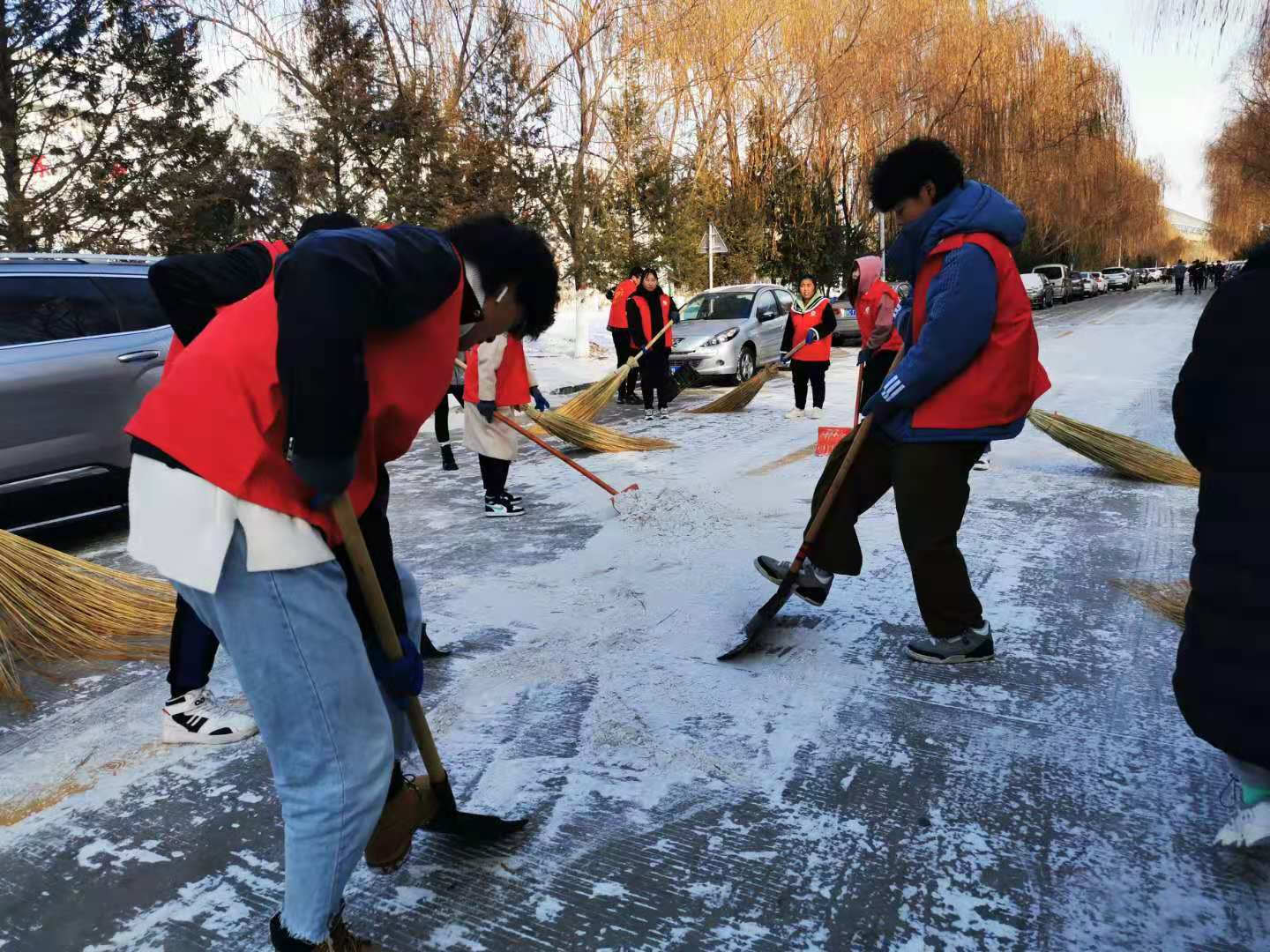 當日下午,管理與旅游系2020級旅游2班和2019級會計1班29名同學穿上紅馬甲,帶上白手套,冒著嚴寒,攜帶鐵鍬、雪鏟、掃帚等工具來到實訓樓前,清理校園道路積雪。同學們分工合作、配合默契,鏟的鏟、掃的掃,干勁十足。冬天固然寒冷,但同學們的熱情不減。經過2個小時的勞動,道路的積雪被同學們掃得干干凈凈。