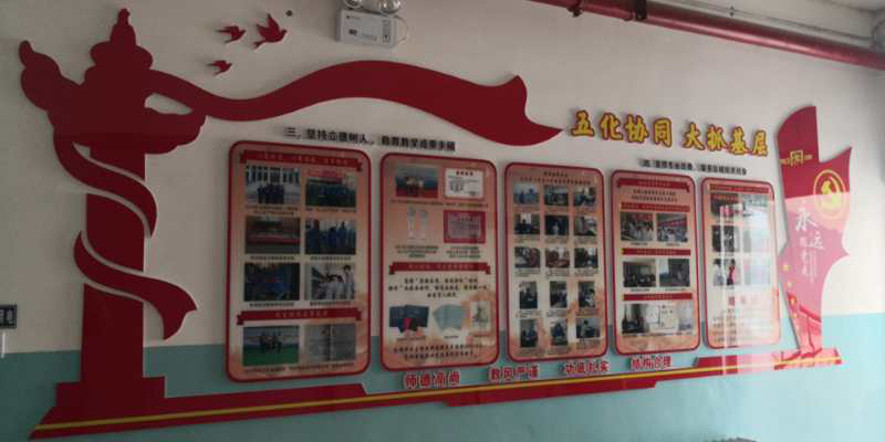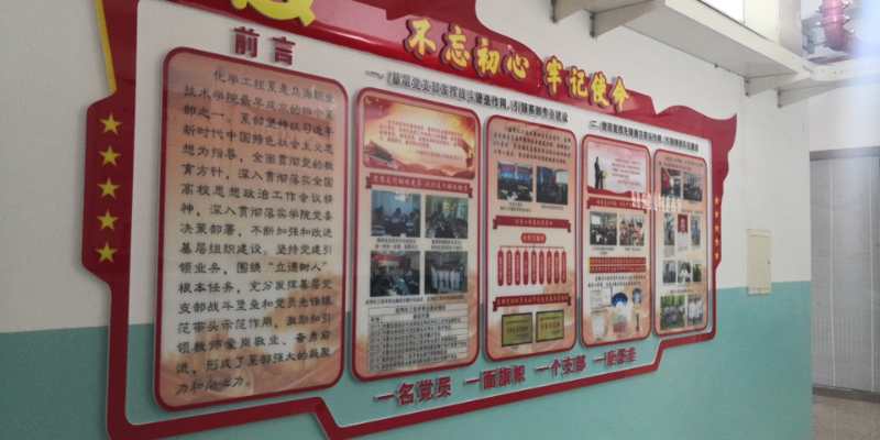黨建文化墻包括“基層黨支部發揮戰斗堡壘作用,引領專業建設;黨員發揮先鋒模范帶頭作用,引領師資隊伍建設;堅持立德樹人,教育教學成果豐碩;發揮專業優勢,服務區域經濟社會”四大部分,由兩大幅10小幅墻體宣傳廣告組成。